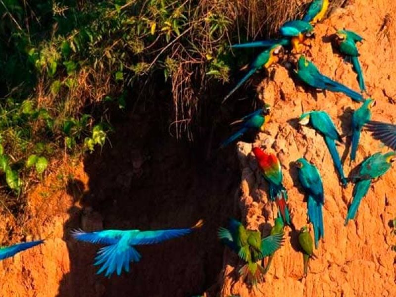 Al amanecer, visitarás una última collpa de loros y guacamayos, donde el cielo se llena de colores con el vuelo de estas aves.